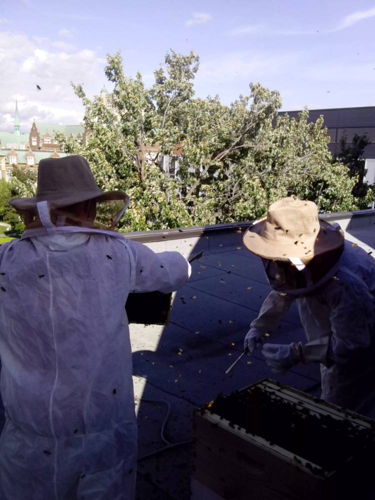 The City Farm School, part of the Concordia Greenhouse, has been keeping honey bees on the roof of the SP building. Check out these recent photos that were taken this past week of our bees in action!
