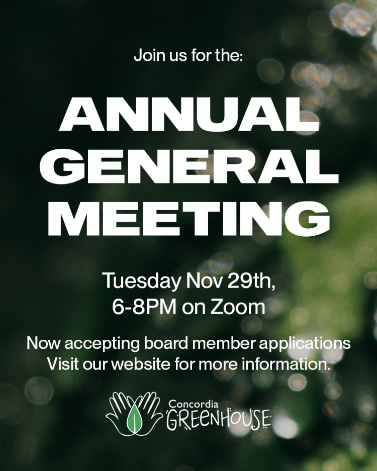 Join us on Tuesday, November 29th 2022 at 6:00 PM for the Concordia Greenhouse Annual General Meeting! This year we will be holding our AGM virtually on Zoom, and you can register via this link.