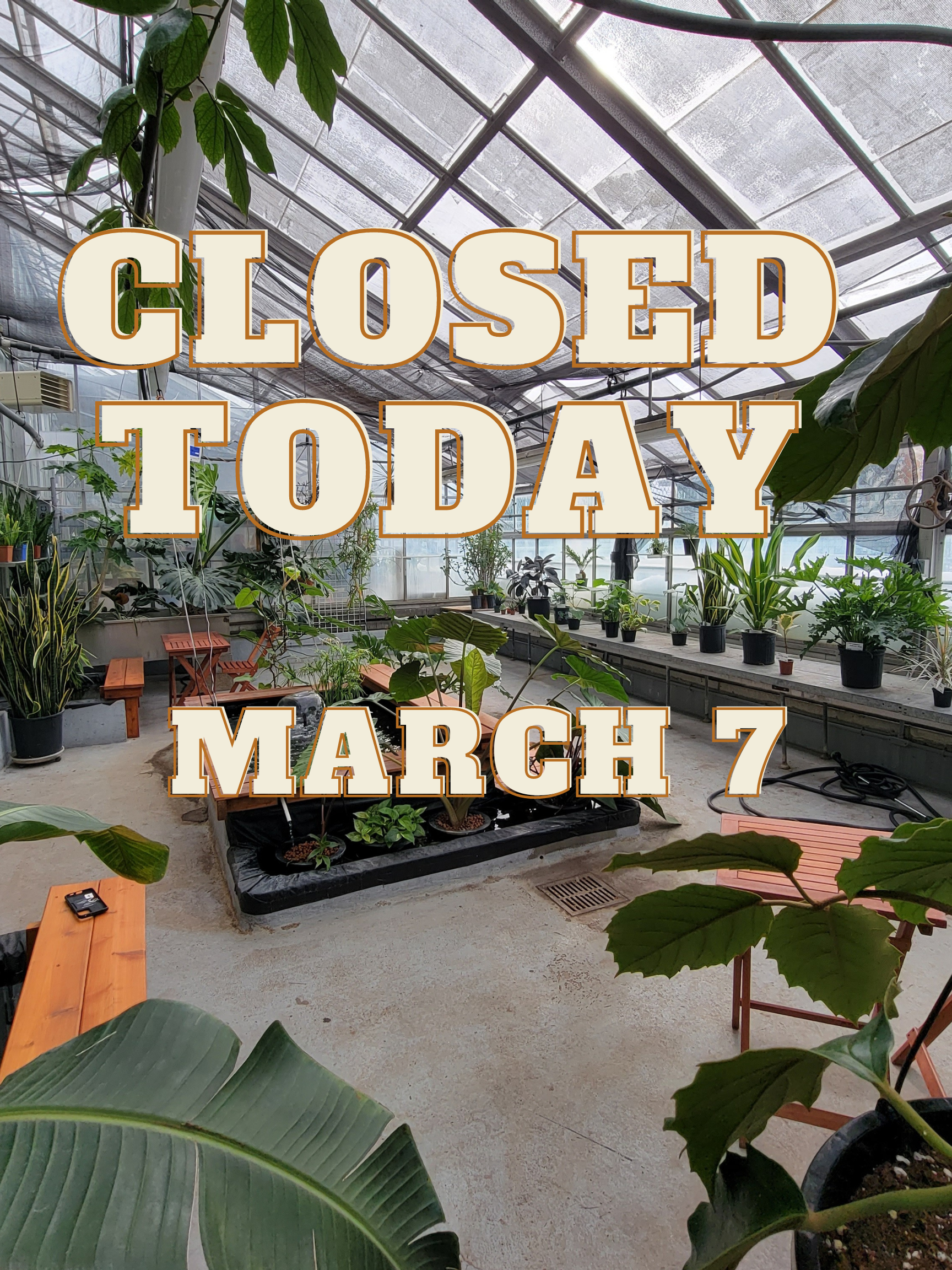 Hey everyone, we will be closed today for staff training. Sorry for the inconvenience. We will be back Wednesday (March 8th) with sunshine and more greenery!