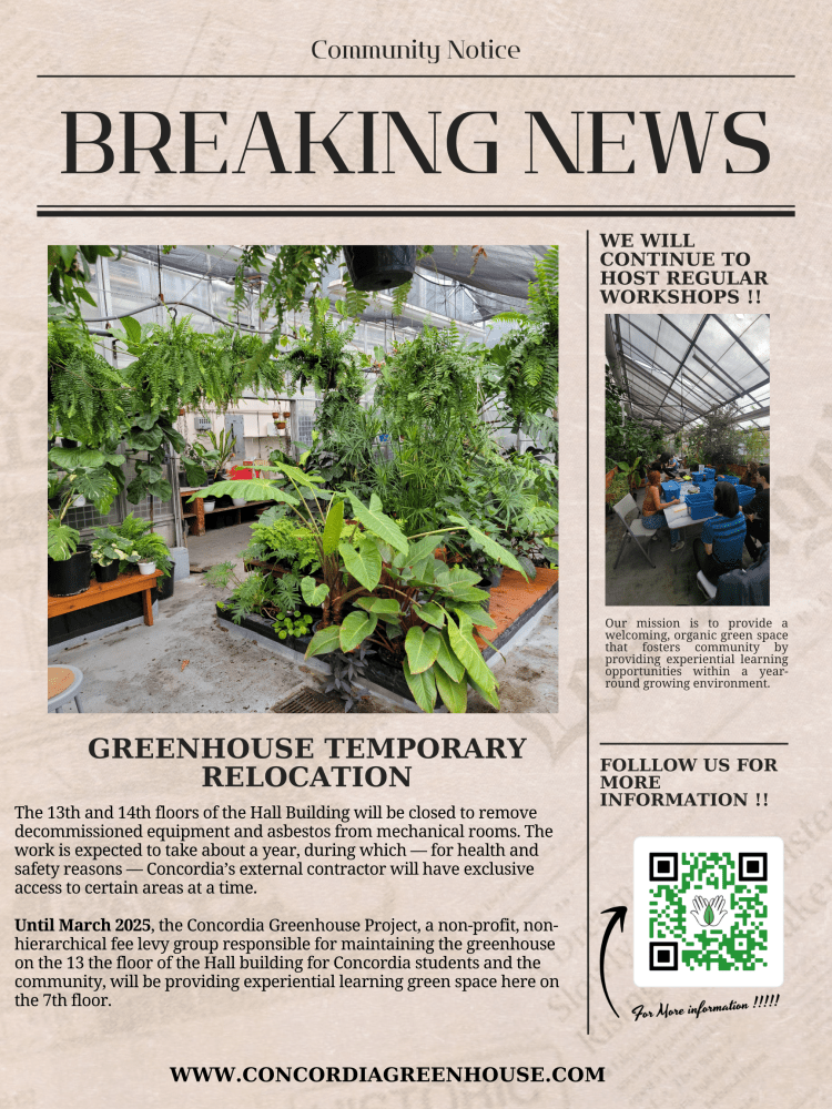 Hello, students! As we kick off another exciting academic year, we are thrilled to introduce you to a unique and vibrant space on campus, the 7th Floor Concordia Greenhouse office. This temporary location will serve as a hub of relaxation, creativity, and community for both new and returning students.